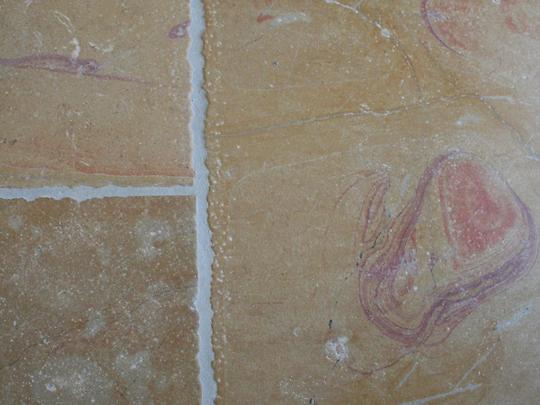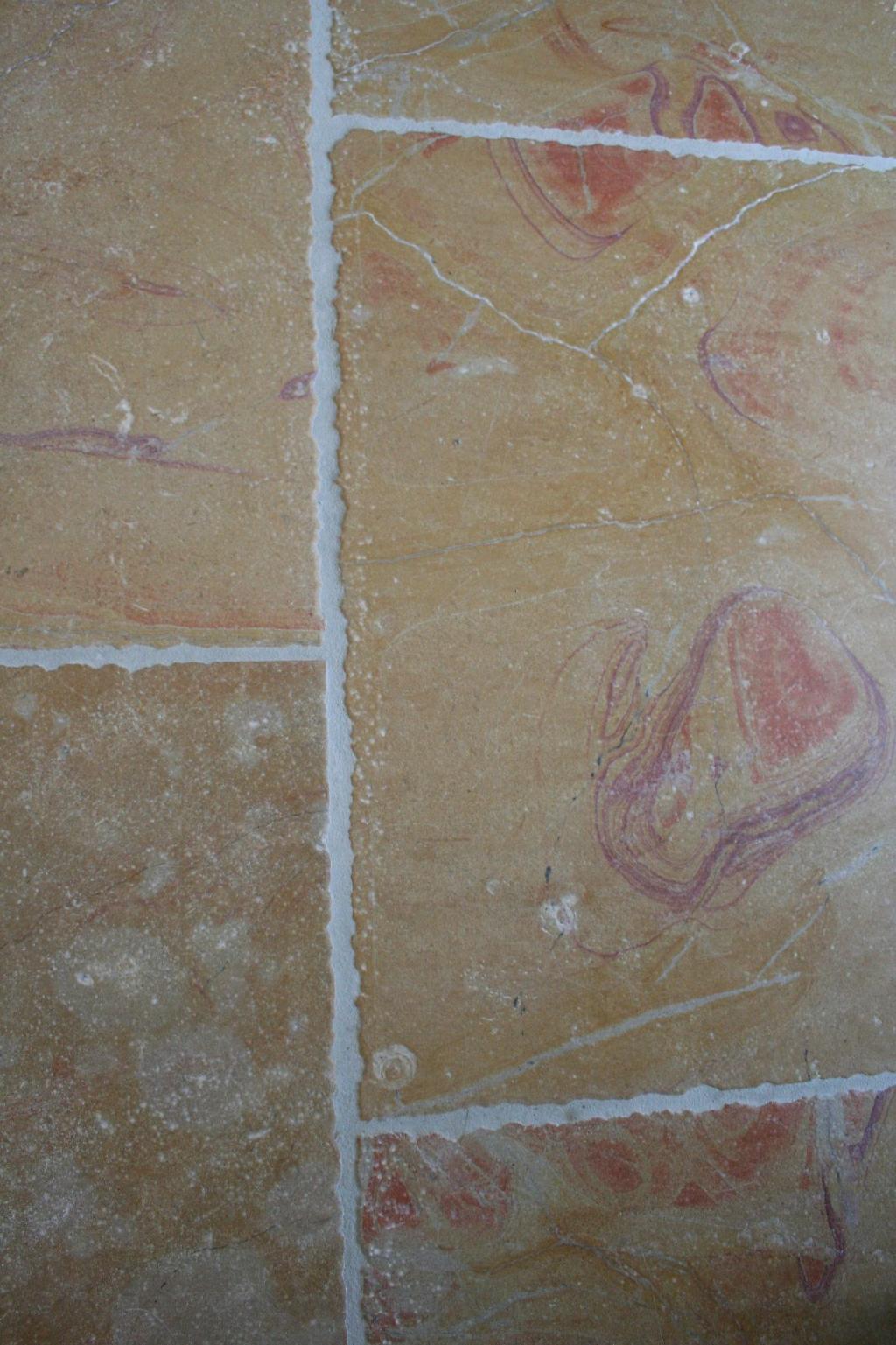 Pierre marbrière homogène et compacte de coloris moyen brun. Présence de marbrures rosées d'aspect nuageux se fondant dans l'ensemble